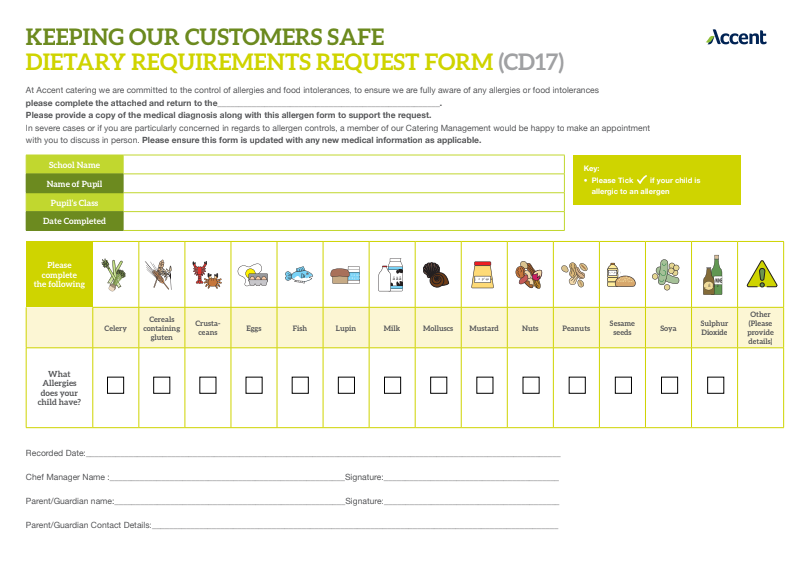 For children with special dietary requirements, you will need to complete a 'Dietary Requirement Request Form'. Medical documentation will need to be attached to the referral form and sent to Accent.
